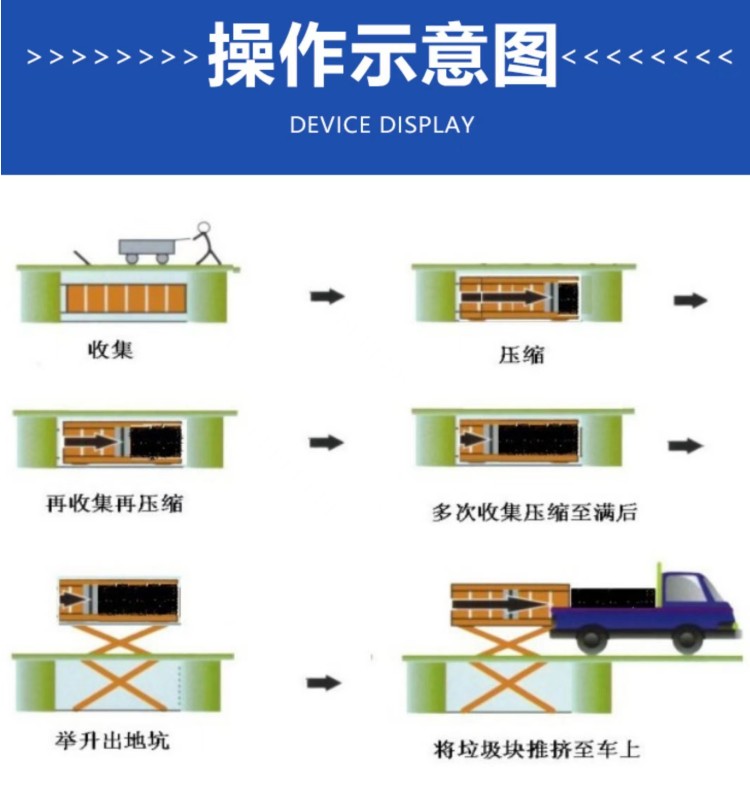 ◇平穩(wěn)可靠:兩側(cè)舉升,剪叉跨度大,升降平穩(wěn),無(wú)傾斜; ◇淺地坑:地坑深度僅為1.55m,保潔及維修極為方便; ◇高效率:壓實(shí)每噸垃圾時(shí)間≤10min; ◇全封閉水平壓縮:采用水平壓縮方式,垃圾壓縮密度≥0.86t/m3,垃圾壓縮后體積大大減小,從而大幅度提高轉(zhuǎn)運(yùn)車(chē)輛裝載量和轉(zhuǎn)運(yùn)效率,降低垃圾處理、轉(zhuǎn)運(yùn)等費(fèi)用; ◇動(dòng)作少,故障率低,整套設(shè)備的垃圾壓縮、裝車(chē)由三個(gè)動(dòng)作完成,簡(jiǎn)單實(shí)用,各動(dòng)作之間安全互鎖,防止操作人員誤操作造成安全事故,安全可靠; ◇垃圾儲(chǔ)存、壓縮及寄存全部在地面以下,地面上沒(méi)有垃圾散落,對(duì)環(huán)境影響較小,環(huán)保性好;垃圾壓縮后密度高,水份少,可避免汽車(chē)運(yùn)輸中的垃圾散落、污水滴漏現(xiàn)象,避免二次污染; ◇土建費(fèi)用低,占地面積小,可以不蓋大型工作間,既節(jié)約了投資,也縮短了工期; ◇留有專(zhuān)門(mén)的維修窗口,維修保養(yǎng)方便; ◇設(shè)有固定式操作和遙控器兩種操作模式,方便實(shí)用; ◇自動(dòng)化程度高,可大幅提高工作效率,降低勞動(dòng)強(qiáng)度。